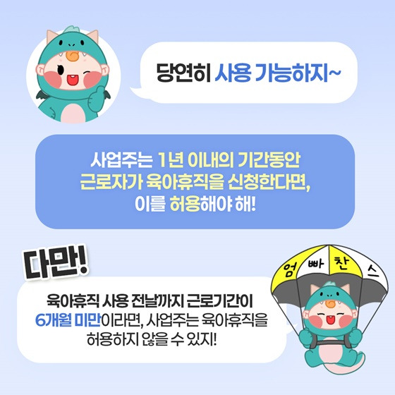 육아휴직은 자녀가 만 8세 이하이거나 초등학교 2학년 이하인 경우에 사용할 수 있는 제도입니다. 이 제도를 통해 부모는 자녀와의 시간을 보낼 수 있으며, 자녀의 건강한 성장과 발달을 지원할 수 있습니다. 육아휴직은 부모의 권리이자, 자녀에게도 긍정적인 영향을 미치는 중요한 제도입니다.