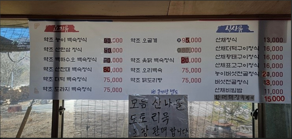 대표 메뉴는 약초능이백숙 정식(₩90,000)이며, 다양한 약초 백숙 메뉴와 산채 정식도 준비되어 있답니다.