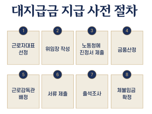 이러한 절차를 통해 대지급금을 신청할 수 있으며, 각 단계에서 필요한 서류와 절차를 정확히 이행해야 합니다.