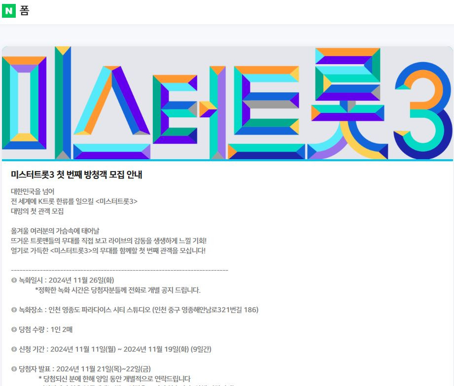 방청신청을 하실 때 감동적인 사연을 적어주시는 게 좋습니다. 트롯과 관련된 특별한 사연도 당첨확률을 높일 수 있으며 가수의 대한 애정이라던지 트롯음악으로 인생에 많은 도움이 된다라는 그런 사연을 정성스레 적어서 신청하신다면 당첨될 수 있을 것입니다. 그리고 방청신청을 하여 당첨이 되면 서울 02 번호로 전화가 오니 꼭 받으셔야 당첨이 확정됩니다.