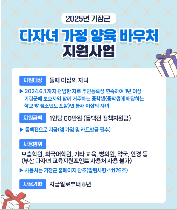 기장군에 거주 중인 다자녀 가정이라면 놓치지 마세요! 중학생 이상 둘째 자녀부터 받을 수 있는 양육 바우처 지원금 60만원, 지금 바로 확인해보세요.