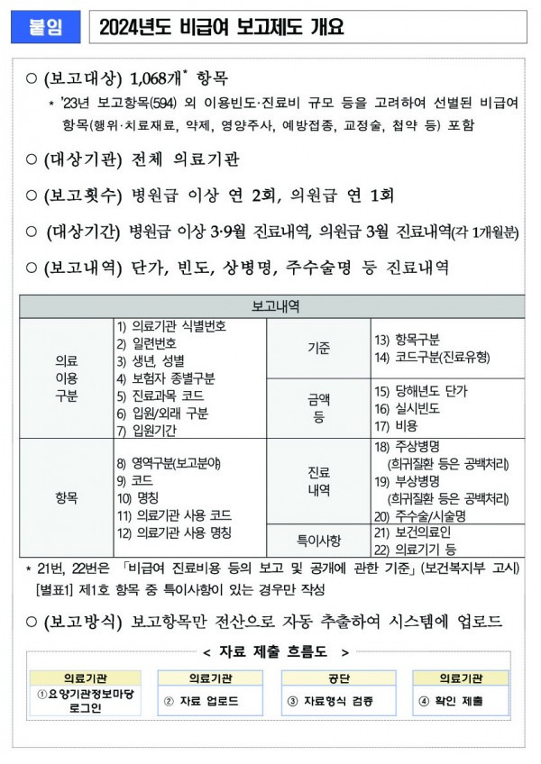 2024년부터는 비급여 진료비의 보고 체계가 더욱 엄격해집니다. 모든 의료 기관은 비급여 진료비를 보고해야 하며, 총 1,068개의 항목이 보고 대상에 포함됩니다. 이 보고 체계는 의료 서비스의 투명성을 높이고, 환자들이 보다 정확한 정보를 바탕으로 의료 서비스를 선택할 수 있도록 돕기 위해 마련되었습니다.