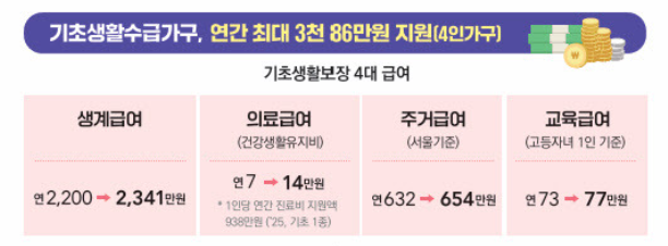 - 생계급여는 의복, 음식, 연료비 등 일상생활에 필수적인 비용을 수급자에게 현금으로 지원합니다. 대상자는 기존의 기준 중위소득 30% 이하에서 32% 이하로 확대되었습니다. 4인 가구 기준으로는 13.16% 증가했습니다.