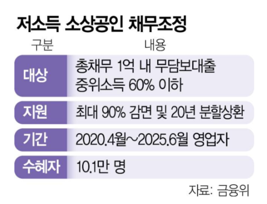 • 저소득 소상공인 중 ‘총채무 1억 이하 + 중위소득 60% 이하’ 대상 → 90% 원금 감면 & 최대 20년 분할상환
