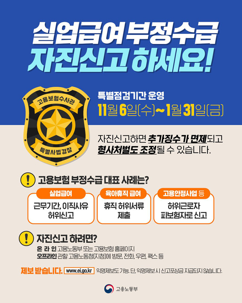 2024년 11월 6일(수) ~ 2025년 1월 31일(금)까지 실업급여 부정수급 특별점검 기간이 운영됩니다. 이 기간 동안 고용노동부는 집중적으로 부정수급 사례를 점검하고, 자진신고를 장려하고 있습니다. 만약 부정수급 사실을 자진신고할 경우, 추가 징수가 면제되며 형사처벌도 조정될 수 있어, 문제 해결을 위한 기회를 제공합니다. 자진신고를 통해 더 큰 불이익을 피하시길 바랍니다.