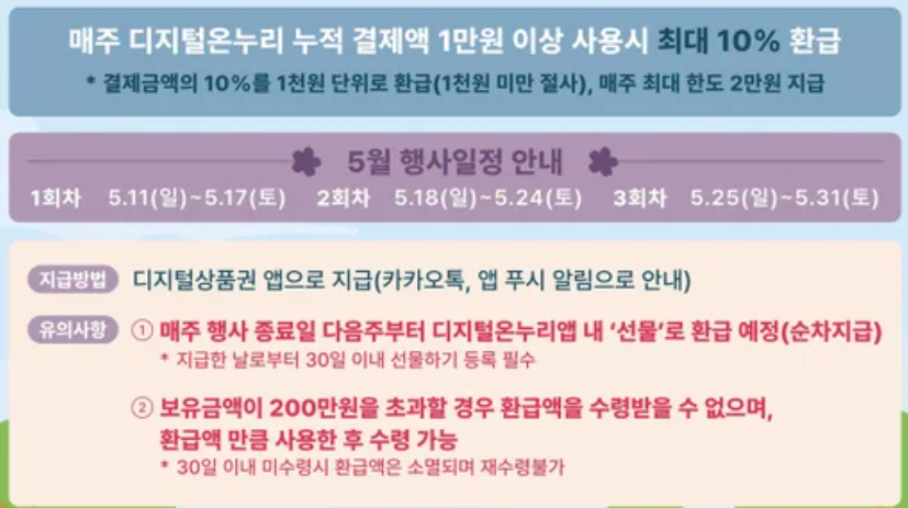 또한 디지털 온누리상품권 보유금액이 200만 원을 초과할 경우 추가 환급 수령이 불가능하니 계획적으로 사용하셔야 합니다.