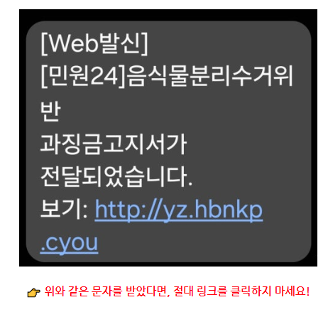 최근 ‘음식물 분리수거 위반 과태료’ 관련 **스미싱 문자**가 발생하고 있습니다.