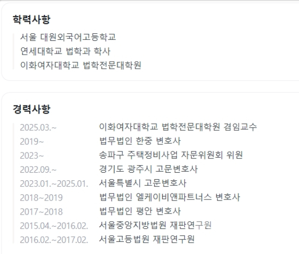 1984년생으로 올해 만 40세인 그녀는 서울 대원외고, 연세대 법학과, 이화여대 로스쿨을 졸업한 탄탄한 엘리트 코스를 밟은 인물입니다. 현재는 법무법인 한중의 변호사이자 이화여자대학교 로스쿨의 겸임 교수로 재직 중입니다.