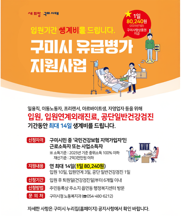 병가 내면 생계가 막막한 분들께 꼭 필요한 정보입니다. 구미시에 사시는 근로취약계층이라면 지금 바로 확인해 보세요! 단 14일, 최대 110만 원의 혜택을 놓치지 마세요.