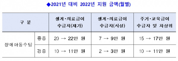 장애아동수당의 지원금액은 아동의 장애 정도에 따라 다르게 책정됩니다. 2021년과 2022년의 지원금액을 비교해 보면, 중증 장애아동의 경우 월 20만 원에서 22만 원으로 증가하였고, 경증 장애아동의 경우 월 10만 원에서 11만 원으로 조정되었습니다. 이러한 지원금액은 아동의 의료비 및 교육비에 사용될 수 있습니다.