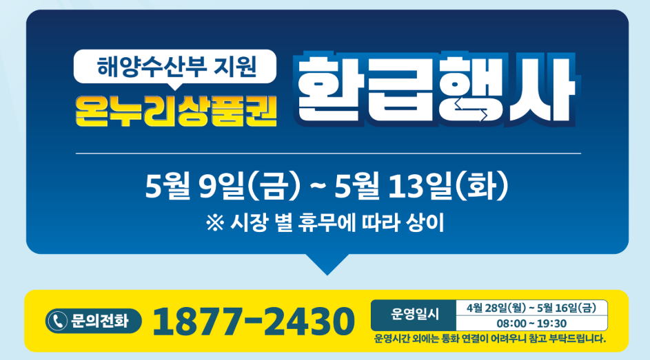 소비자는 행사 기간(5월 9~13일)에 수산물을 구매한 뒤, 해당 시장 내 환급 부스를 방문해 영수증과 신분증 또는 휴대전화를 제시하면 본인 확인 후 온누리상품권으로 환급받을 수 있습니다.