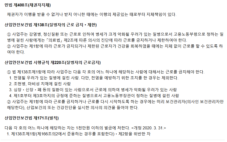 그러나 산업안전보건법에서는 특정 질병에 대해 근로금지 조치를 취할 수 있습니다. 심각한 전염병이나 정신질환, 심장, 폐, 신장질환과 같은 심각한 건강 문제는 근로자가 일을 할 경우 건강이 악화될 위험이 있는 질병으로 분류될 수 있습니다. 이 경우, 의사의 진단을 바탕으로 회사는 근로 제공을 거부할 수 있으며, 이는 법적으로 정당화됩니다.