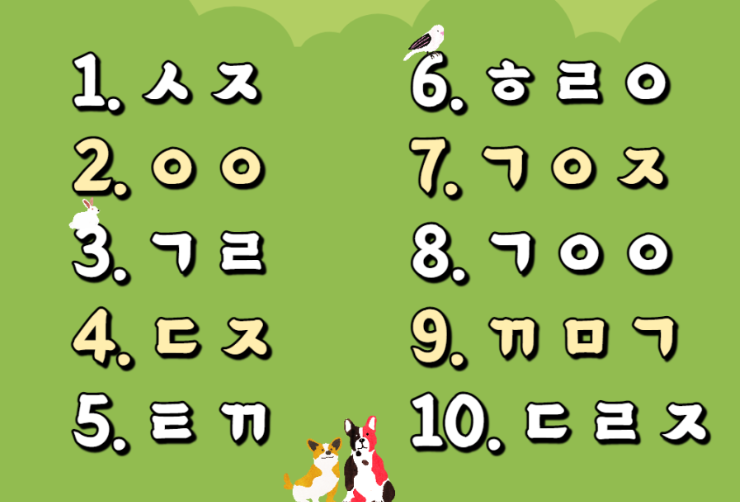 이번게임을 동물이름 초성으로 맞추기입니다. 1분 안에 7개 이상 맞추시면 치매와는 거리가 멀어지게 되겠습니다~!!