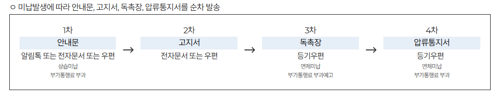 미납을 장기간 납부하지 않을 경우에는 아래와 같은 조치가 취해지니 유의하시기 바랍니다.