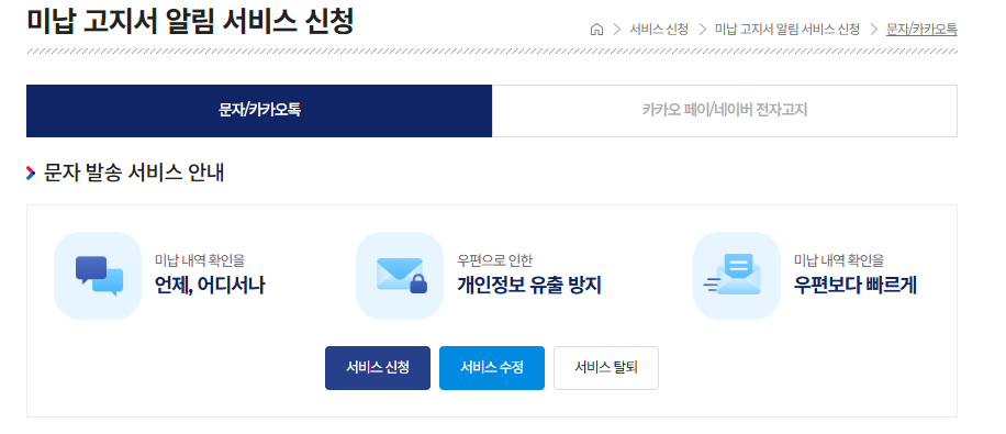 ▶미납상황이 생겼을 때 문자로 알려주는 서비스를 신청하시면 편리하게 납부하실 수 있습니다.