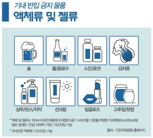 • 액체류 반입 시에는 100ml 이하의 용기에 담아 투명한 비닐 지퍼백에 넣어야 합니다.