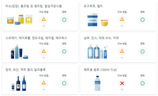 • 화장품 (100ml 이하, 투명 지퍼백 보관 필수)